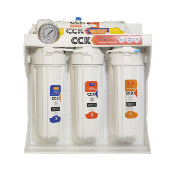 دستگاه تصفیه آب خانگی سی سی کا 6 مرحلهای دارای فیلتر الیافی به عنوان فیلتر اول و فیلتر کربن پودری به عنوان فیلتر دوم و فیلتر کربن اکتیو به عنوان فیلتر سوم است. این سه مرحله اولیه به عنوان پیش تصفیه عمل میکنند . فیلتر چهارم ممبران به عنوان فیلتر اصلی قرار دارد و فیلتر پنجم پست کربن و فیلتر ششم مینرال ( برای تنظیم املاح معدنی) است. مخزن دستگاه تصفیه کننده CCK، تانک مکس چهار گالن است.